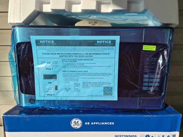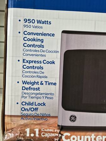 BRAND NEW, never used, GE Countertop Microwave Oven with a Stainless Steel Finish. This GE has a 1.1 Cu. Ft. capacity with 950 watts of power. This countertop microwave features a digital display, convenience cooking controls, one touch instant on controls, weight and time defrost, add 30 seconds button, a timer, and a turntable that rotates food throughout the cooking cycle. It also includes child lock and control lockout for added safety. Retails for $175 +tax. Save $$ here!!