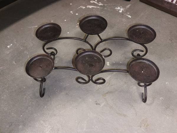 Nice rough iron candle holder . Measures 9in t by 17in w.