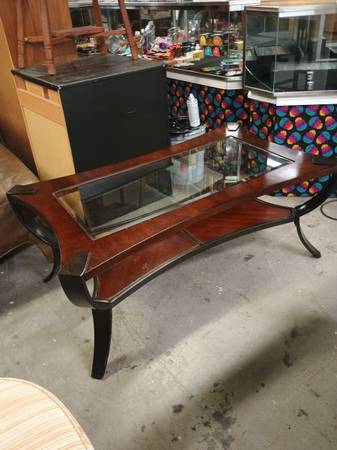 Nice dark wood and glass coffee table. Very unique look. Measures 19.5in t 4ft w and 28.5d.