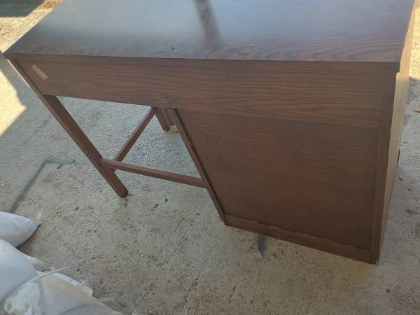 Great little desk with chair. Can be refinished or used as is can be used in a house or office. Can also be used as a vanity as well. Good amount of drawer space for storage. Desk measures 30in t 42in w and 18in d chair measures 38in t 18in w and 17in d. Seat height is 18in t.