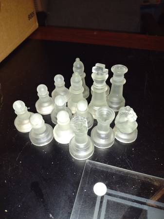 This is a neat glass chess set board measures 13.5in by 13.5in. does have a small chip and is missing one piece. You can find a replacement or use a different piece.