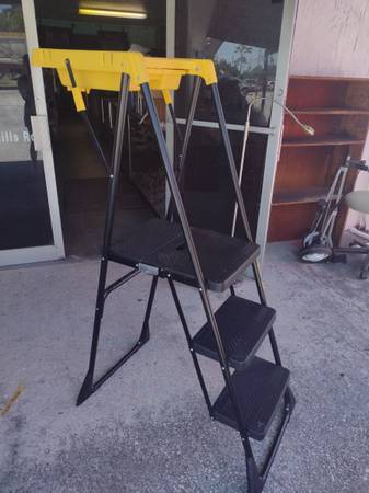 This is a cosco brand foldable step ladder in great condition this is a very heavy duty one that even has a foldable tray to set tools or items needed for the job your doing. Then folds up for easy storage when not in use. Highest step is 32in t total measurements are 57in t 21w and 34d when open.