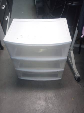 Plastic 3 drawer organizer can be used in many different ways. Measures 2ft tall 21 3/4 w and 15.5 in d.