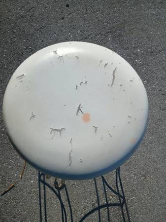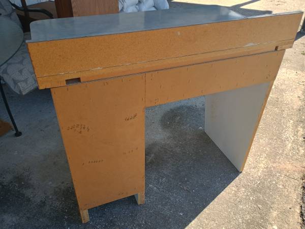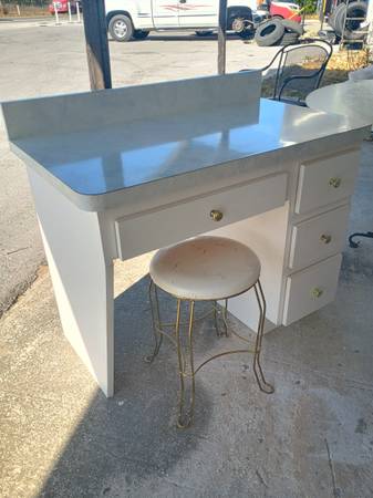 Nice white make up vanity no mirror included. Has lots of drawer space. Also includes the stool. It has a vinyl top that does have some cracks can be used as is or redone very easily. vanity measures 30in t 38.5in w and 22in d. Stool measures 18in t and 13by 13in round in diameter.