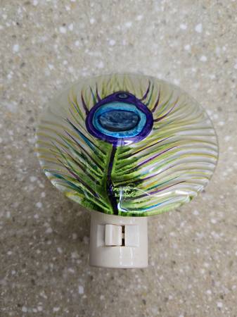 Vintage Cracker Barrel Night Light Round Glass Peacock Feather Hand Painted Rotate Plug