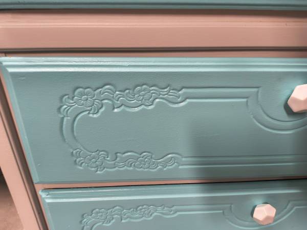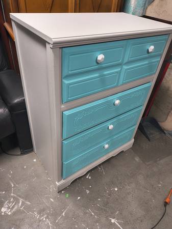 Freshly painted in nice and bright vibrant colors and new hardware. Has a total of 4 good sized dovetailed drawers. Dresser measures 42in t 32in w and 18in d.