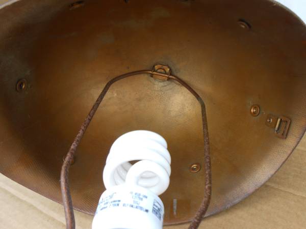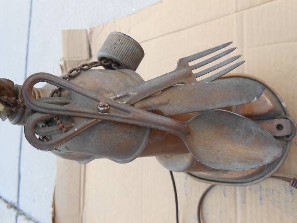 Custom made 27" tall lamp assembled with US Army mess kit, utensils, canteen, cup holder and helmet from the Korean War. Has pull chain on/off switch. Has a 3 foot long cord that has been spliced...