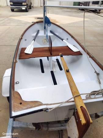 8’ fiberglass skiff, 14.5’ mast, rudder, centerboard, rigging, and sail, with oars (two sets), and an anchor. The trailer is galvanized, 2” hitch, with good tires, and working lights. Just add water...