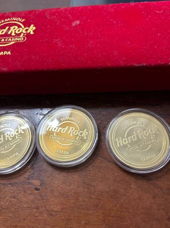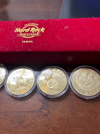 5 MINT COINS, ACTUALLY CASINO CHIPS; GOLD PLATED, NOT PURE GOLD. GORGEOUS CASE. GREAT ADDITION FOR ANY CASINO ARTIFACT COLLECTOR. DATED 2015.