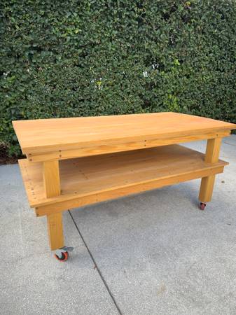 This table was built right — thick top, strong joinery, and industrial wheels, so you get the stability of a heavy piece with the convenience of mobility. Rolls easily, locks in place securely.