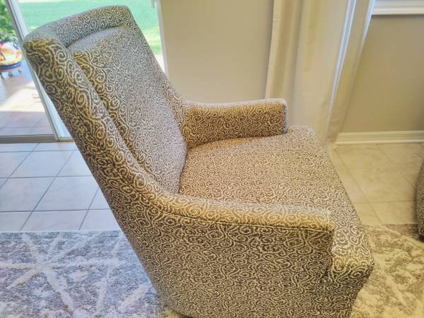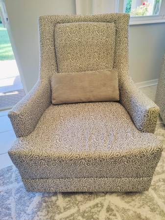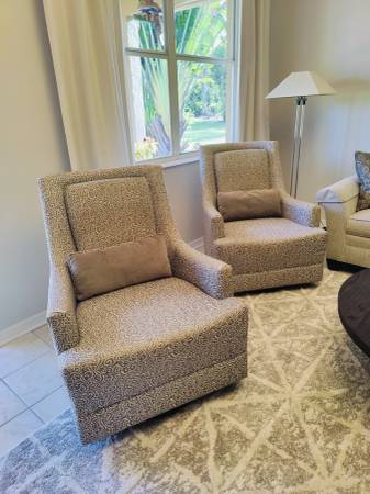 2 swivel rockers are in good condition!! We paid $1,300 each, so they are well built.They are so comfortable and we have enjoyed the swivel feature from watching TV to talking on the couch. H 40' W 30 1/3" height from seat to top of back is 27" and 24" from the back of the seat to the front. We are just redecorating. No smoking, no pets, clean home!!!