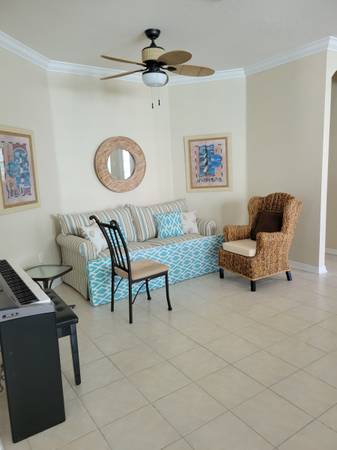 Open layout of 1960 sqft on a single level with 3 BD, 2 BA. Screened lanai with pond views. Tile flooring throughout the home and carpeted bedrooms. Updated kitchen with granite countertops and stainless steel appliances. Quartz countertops in the bathrooms with tiled showers. Laundry room includes washer/dryer. Huge Great Room with triple sliders leading to an expansive paver patio. Crown molding and window trim throughout the home. New HVAC system (2020). New roof (2023). New hot water heater (2024). Other amenities include wall mounted TVs throughout, a Jacuzzi jetted tub in the Master Bath. All furniture, beds, kitchenware and wall hangings included!