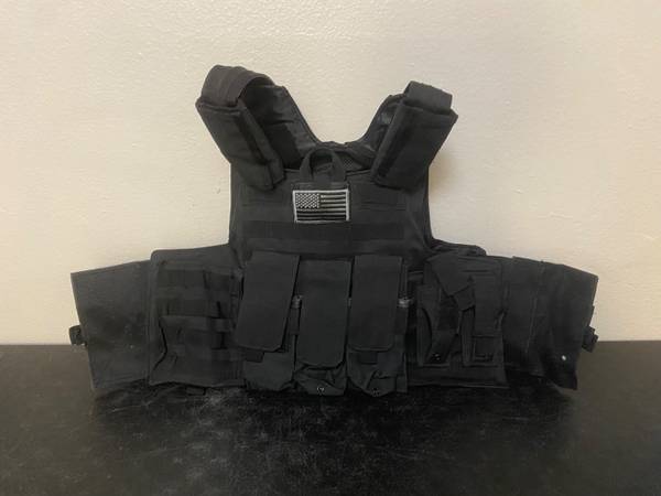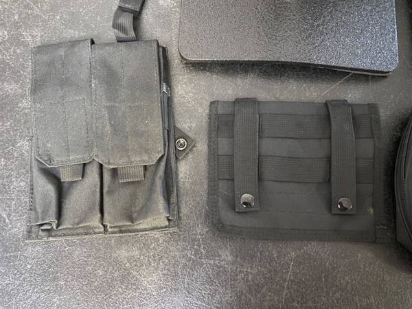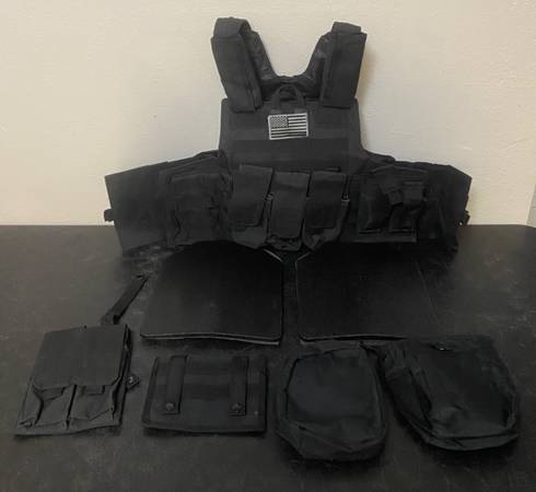 Nice tactical vest, comes with two Lvl 3 plates. I am not splitting the vest and plates. Vest should fit Small and Medium, can adjust much bigger than small. I am 5'6" and muscular and fit me well, can easily fit someone larger. I also bought a lot of extra attachments to it including Glock holster, ammo pouches and more. I never wore it outside, it mostly stayed in storage so it's like new. Must pick up in Brandon.