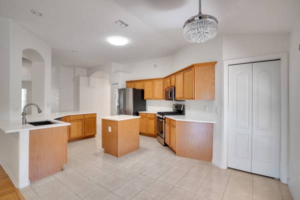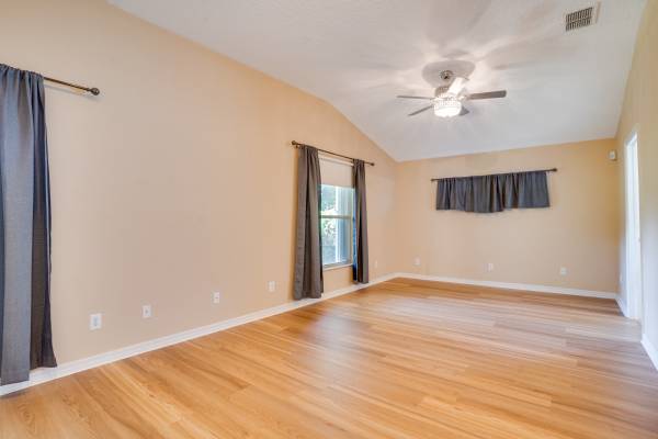 Very comfortable 3 bedroom, 2 bath home with large 2 car garage and very large screened in Lanai for outdoor fun! Open floor plan provides a nice living situation with a large kitchen having lots of counter space, bar seating, eat in area for a sizable kitchen table, large great room and a flex area for either a formal dining room or home office area. Gas stove cooking! The huge master bedroom is on the back side of the house with 2 closet areas and ensuite master bath featuring double vanities and a huge soaking tub and separate shower. The Master is also big enough to set up a work area as well. 2 additional larger bedrooms share the second bathroom towards the front of the home. Oversized Washer and Dryer included. Hard surfaces through-out the home and pet friendly. Home security system in place available for tenant's service plan.