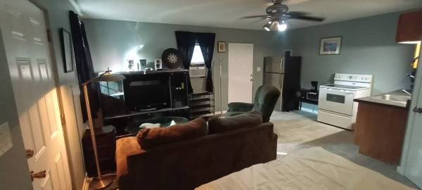 refrigerator full size stove/ with oven, kitchenette coffee maker ,blender , electric skillet,and more ,full size bathroom with tile floor with stereo ,dvd player,lazy Boy recliner, couch,ceiling fan lights, air conditioning and Heat, new bed ,new microwave, new toaster!!!!outside covered wooden deck, with bbq grill, private entrance totally quiet and private Totally Secure behind a 6 ft privacy fence close to grocery, Banks, shops, beaches, and bus stops, too much to list come look, turn key ready..