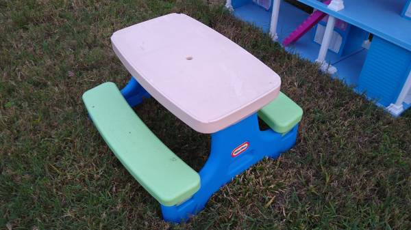 Little Tykes Picnic Table, Smaller, folds up, heavy duty PVC/Plastic construction, can accommodate 4 small children., green, blue, yellow top, very good condition.