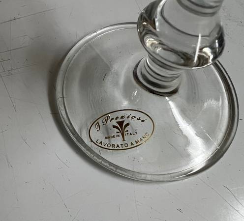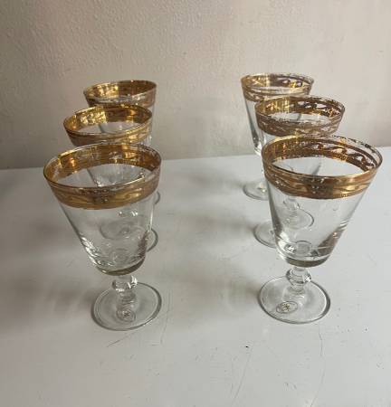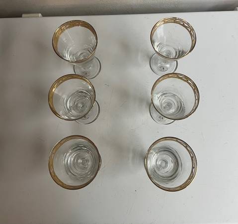 This is a vintage set of 6 Italian wine glasses by Preziosi Lavarato A Mano with gold rims and etched design and no chips in good condition.