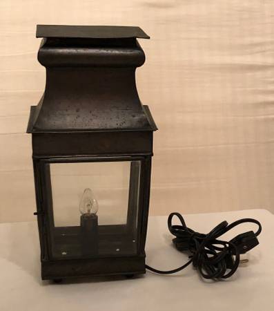 Electric black square metal lantern (vintage looking patina) with glass panels, openable glass door, bulb and toggle switch. Pick up and cash only.