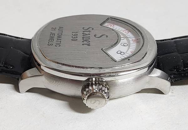 The Stauer 1930 Dashtronic- deftly blends the modern functionality of a 21-jewel automatic movement and 3-ATM water resistance with the distinctive, retro look of a jumping display (not an actual jumping complication). True to "Machine Art" aesthetics, the sleek brushed stainless steel case is clear on the back, allowing a peek at the inner workings. Fits wrists 7"-8½".