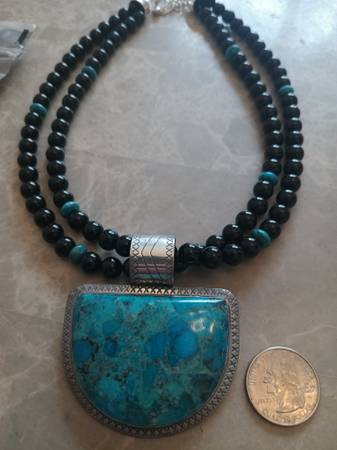Very large Turquoise native American Sterling silver necklace with beads.. never warn. Adjustable length . Please no emails call . Very large turquoise pendant..will sell separately .the beads are...