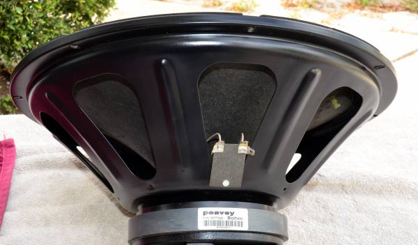....This is a perfectly working Peavey 15-inch woofer. Taken from a working Peavey PR-15 PA speaker. (Because speaker parts are more valuable than whole speakers)...Part number 70777232...It's rated at 800-watts peak, 400-watts-program, 8-ohms. I don't know the high end but the low frequency is 49-Hz. It has a Transducer Complement Heavy duty 15" woofer with a 2-3/8" voice coil. The cone surrounds are the type that do not wear out.