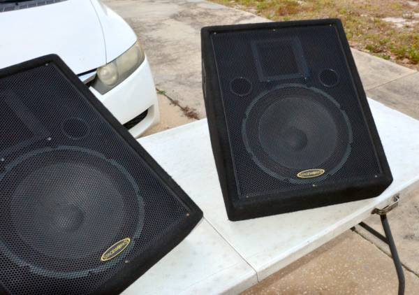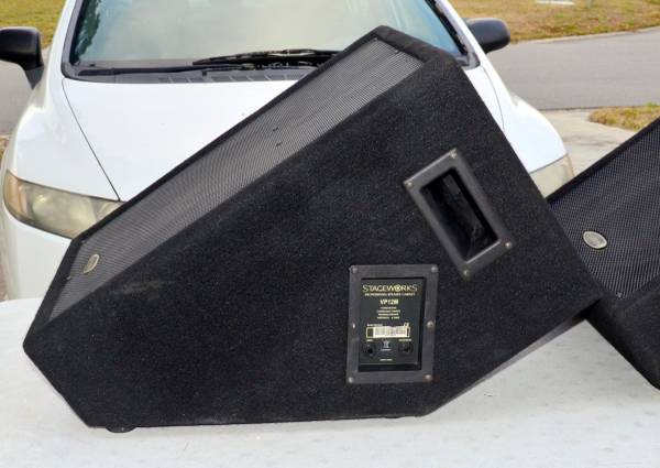Two working Stageworks VP12-M Monitor Speakers, that Sound Great! With a 12"-woofer and Piezo horn tweeter, 125-Watts program, 250-Watts peak, at 8-Ohms. These are budget-conscious, robust floor monitors for getting clear sound on stage without breaking the bank. I have two Peavey PR-15 PA Speakers for sale also and these put out better bass!