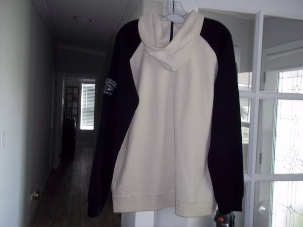 1XL women's white and black draw string hoodie, zipper front closure and 2 kangaroo pockets
