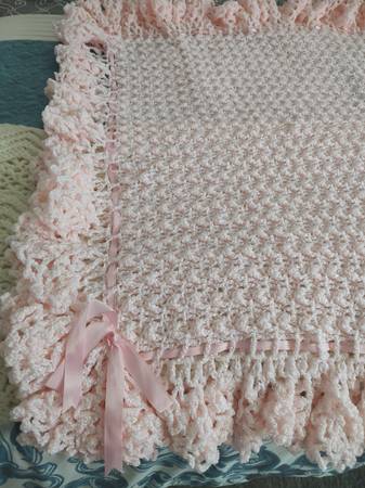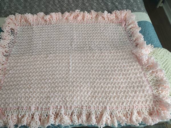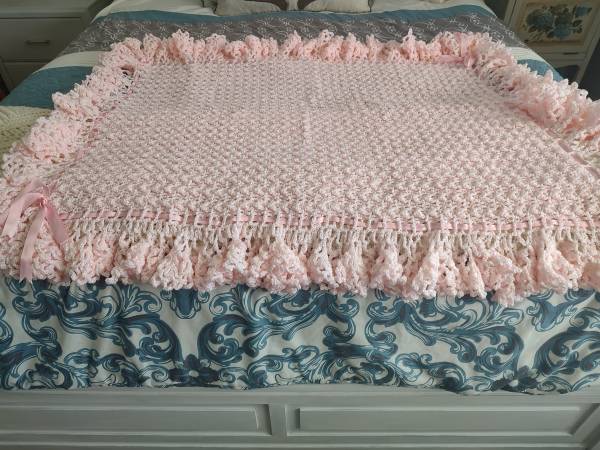 Crocheted pink baby blanket. 37" x 44". $55.00.