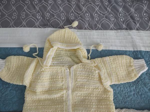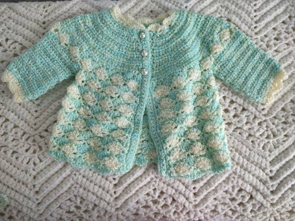 Crocheted baby sweater, hat and booties. Green and yellow. $30.00.
