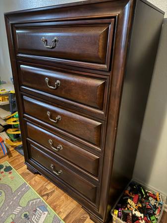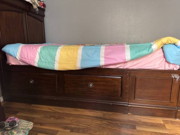 For sale bedroom set. XL Twin Bed, nightstand and 5 drawer tall dresser. $300 obo