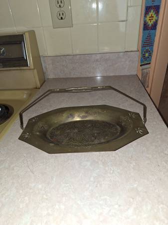 I have never polished this brass item. Very vintage. The tray is shown holding potpourri and plastic grapes.