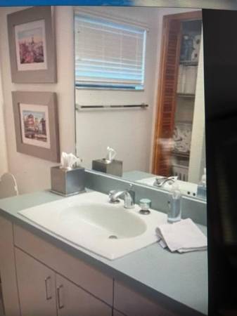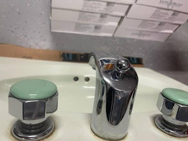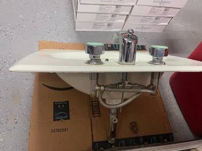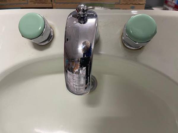 Vintage Honeydew / Light Mint Green Porcelain Sink with Chrome Faucet Set and Unique Color Coordinated Handles. Sink outer size is 26” by 20”, internal bowl size is 18" by 11", apx. 1980's vintage. Valves should be refreshed. Very Good Condition. Cash only at pick-up.