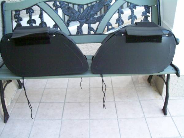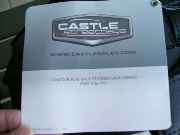 Selling a brand new pair of heavy duty water tight, hard case with velcro closure and locks, Castle extra large slanted, studded, black saddle bags in black. Got these never used them. New cost was $185.00. Still in factory box. Manufactured by Castle Constructed of UV, water and weather-resistant synthetic leather. 18" x 12" x 6" If ad is up these are for sale.