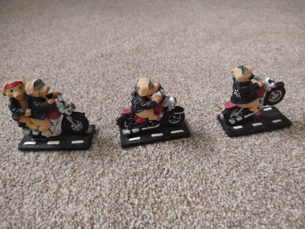 Rev up your collection with these adorable hogs on motorcycles! These charming and detailed figurines are sure to add a touch of whimsy to any space. Each hog is in excellent condition, ready to hit the open road and bring a smile to your face.