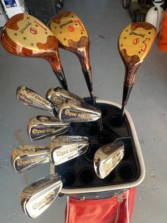 Vintage Spalding Executive Irons and Woods plus Bag. Complete set with 2 dozen balls of your choice. This set is as close to (NEW) with out buying brand new, 3 thru 9 plus pitching wedge. Plus a new ball retriever. The Grips are in Excellent shape. E bay is selling just the Irons for $125.76 plus $33.10 for shipping. My price is $115.00 for Like Brand new Golf Bag, like Brand new Irons, and like Brand new 1,3,5, Woods, with matching Head covers. Irons and Woods look like they never hit a ball. What a deal. Give me a call Richard @ 44zero 22seven zero735. Please either text me or call me but dont ask me to E mail you. Thank you again.Just REDUCED by $20.00